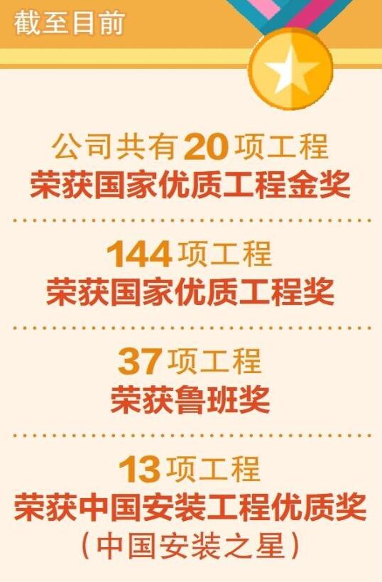 截至目前,公司共有20項工程榮獲國家優(yōu)質工程金獎,144項工程榮獲國家優(yōu)質工程獎,37項工程榮獲魯班獎,13項工程榮獲中國安裝工程優(yōu)質獎(中國安裝之星),在電力行業(yè)始終保持第一,在我國工程建設領域處于領先地位。