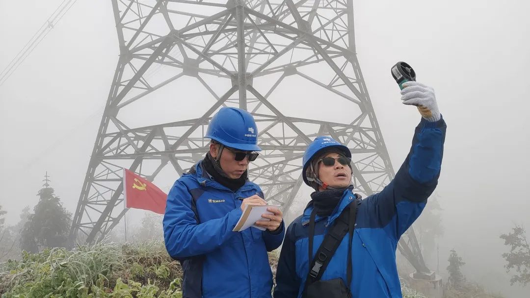 南方電網(wǎng)超高壓公司柳州局黨員突擊隊在500千伏線路所在地測量風速、濕度,量冰厚、觀冰情。(焦偉軍 攝)