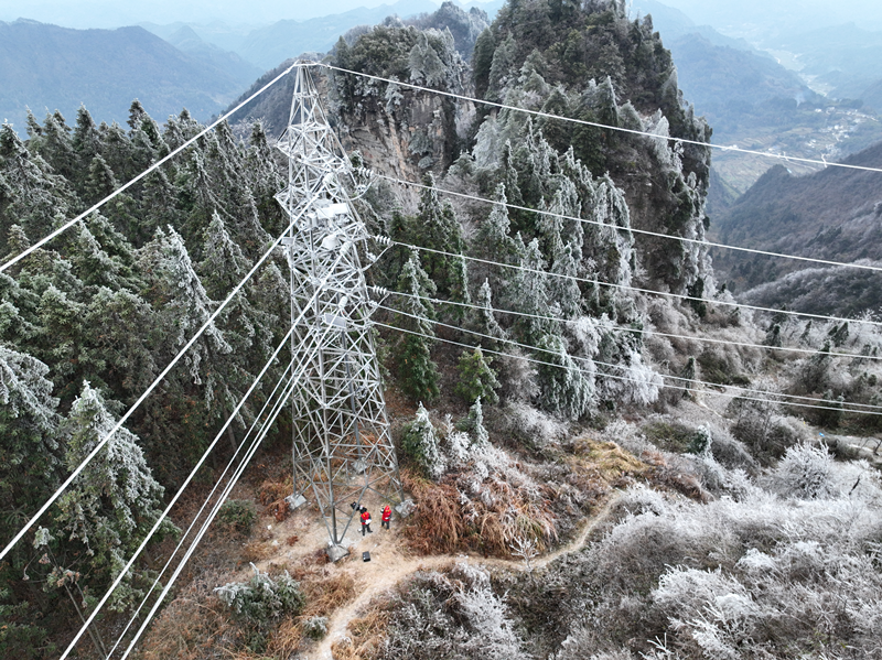 國網(wǎng)湖南張家界供電公司員工對(duì)天子山景區(qū)輸電線路進(jìn)行觀冰測(cè)量