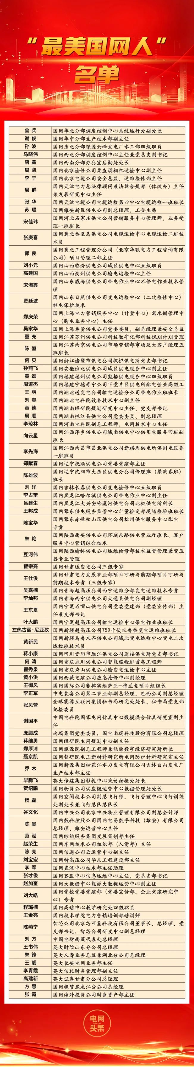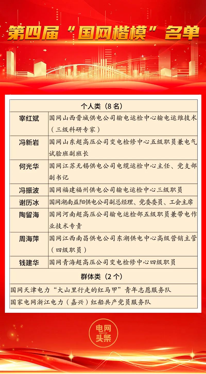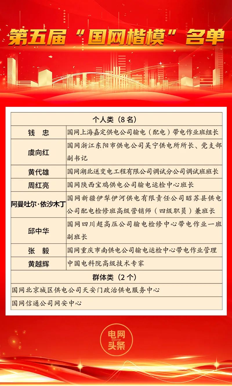 為深入學(xué)習(xí)貫徹習(xí)近平總書記關(guān)于黨的建設(shè)的重要思想和習(xí)近平文化思想,認(rèn)真落實(shí)學(xué)習(xí)貫徹習(xí)近平新時(shí)代中國(guó)特色社會(huì)主義思想主題教育關(guān)于“學(xué)習(xí)身邊榜樣”活動(dòng)要求,充分發(fā)揮先進(jìn)典型示范引領(lǐng)作用,大力弘揚(yáng)電力精神和電網(wǎng)鐵軍精神,凝聚推動(dòng)公司“一體四翼”高質(zhì)量發(fā)展的強(qiáng)大合力,根據(jù)公司黨組統(tǒng)一部署,按照年度表彰計(jì)劃,公司組織開(kāi)展了第五屆“國(guó)網(wǎng)楷模”評(píng)選活動(dòng),與第四屆“國(guó)網(wǎng)楷模”以及“最美國(guó)網(wǎng)人”一并發(fā)布。在各單位培育選樹(shù)、逐級(jí)推薦的基礎(chǔ)上,經(jīng)資格審查、聯(lián)評(píng)投票、專家評(píng)審及公示等環(huán)節(jié),公司黨組研究決定,授予宰紅斌等8名同志和國(guó)網(wǎng)天津電力“大山里行走的紅馬甲”青年志愿服務(wù)隊(duì)等2個(gè)群體第四屆“國(guó)網(wǎng)楷模”榮譽(yù)稱號(hào),授予錢忠等8名同志和國(guó)網(wǎng)北京城區(qū)供電公司天安門政治供電服務(wù)中心等2個(gè)群體第五屆“國(guó)網(wǎng)楷模”榮譽(yù)稱號(hào),授予曾兵等86名同志“最美國(guó)網(wǎng)人”榮譽(yù)稱號(hào)。
