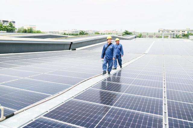 南方電網(wǎng)廣東東莞供電局工作人員為企業(yè)新裝的光伏發(fā)電項(xiàng)目服務(wù),助力企業(yè)綠色低碳發(fā)展。鐘肖如 攝