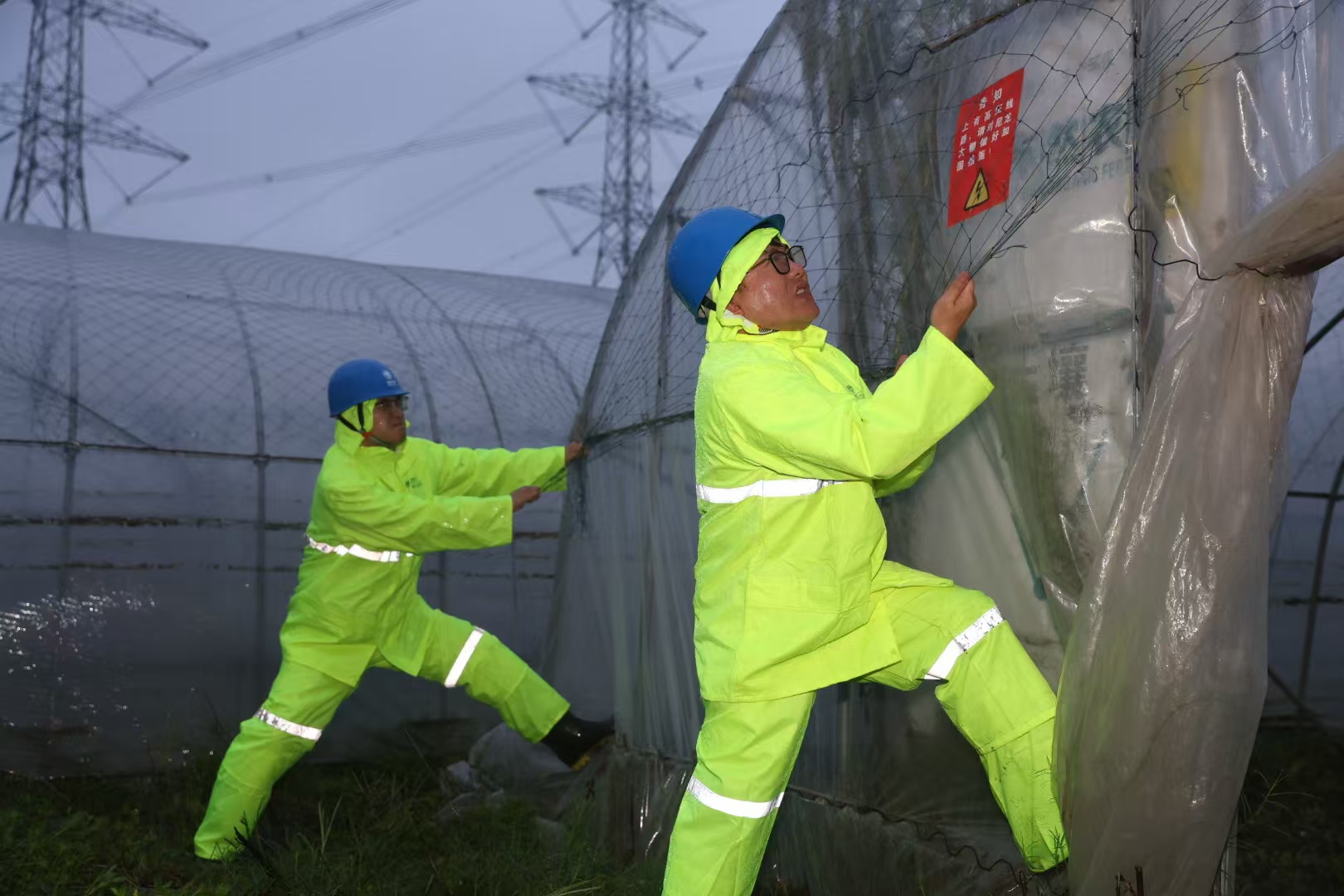 國(guó)網(wǎng)上海超高壓公司輸電運(yùn)維人員在浦東臨港地區(qū)緊急處置輸電通道下破損蔬菜大棚