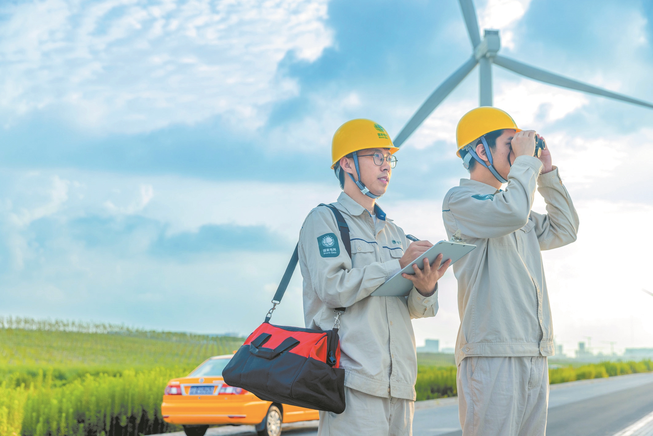 國(guó)網(wǎng)上海電力員工巡檢臨港新片區(qū)風(fēng)電場(chǎng)送出線路