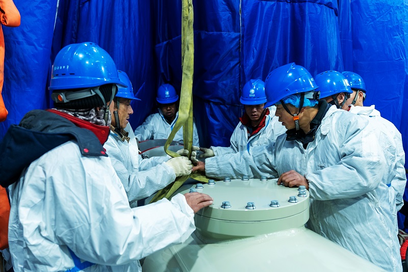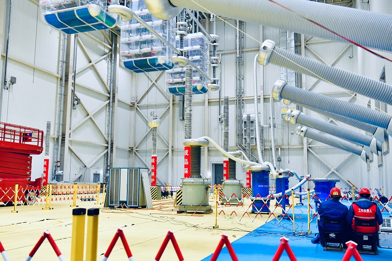 國網(wǎng)山東電力員工在±800千伏東平換流站開展換流變壓器試驗(yàn)工作
