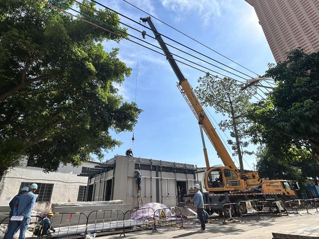 在施工技術(shù)上,江門蓬江供電局不僅引入了自動(dòng)化挖掘機(jī)、起重機(jī)、混凝土攪拌車等機(jī)械,還摒棄傳統(tǒng)配電站的磚瓦結(jié)構(gòu),采用高強(qiáng)度、輕質(zhì)、耐腐蝕的成品預(yù)制墻板及鋼結(jié)構(gòu)等新型建筑材料,結(jié)合裝配式施工工藝,減少以往現(xiàn)場(chǎng)焊接、切割等工藝帶來(lái)的環(huán)境污染,大大縮短了施工周期,還減少建筑垃圾的產(chǎn)生。“與傳統(tǒng)純?nèi)斯な┕し绞较啾龋竟こ虣C(jī)械化率達(dá)到85%,工期壓縮了80%,大大減少了對(duì)附近居民的影響,也降低了施工過(guò)程中的安全隱患。”羅益榮說(shuō)。