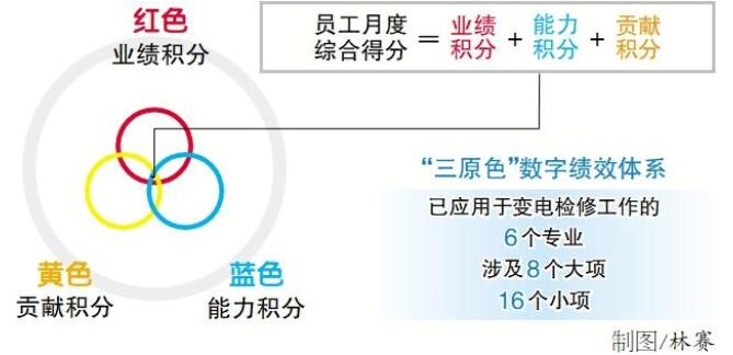 杭州供電公司為適應(yīng)企業(yè)轉(zhuǎn)型升級要求,樹立“工資靠掙、業(yè)績靠干”績效理念,于今年2月8日起在變電檢修中心221名員工績效考核工作中試點(diǎn)應(yīng)用“三原色”數(shù)字績效體系。紅、藍(lán)、黃三原色分別代表衡量工作量的業(yè)績積分、衡量工作能力的能力積分和衡量貢獻(xiàn)大小的貢獻(xiàn)積分。其中,業(yè)績積分又分為安全積分和工單積分。每名員工每個月的綜合得分都由該中心的績效管理員基于業(yè)績、能力、貢獻(xiàn)三個維度計算得出,以實(shí)現(xiàn)薪酬多勞多得、能者多得。