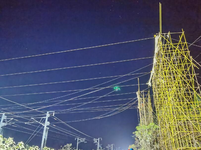 當(dāng)晚0時0分,六旋翼無人機從武西高鐵南側(cè)起飛,牽引著迪尼瑪繩向北側(cè)飛去,地面作業(yè)人員順著無人機的牽拉力量緩緩放繩。鐵路軌道處監(jiān)護人員密切觀測著各級引繩與跨越架之間的距離,通過對講機通知牽張場及時調(diào)整牽張力,確保架線施工順利進行。