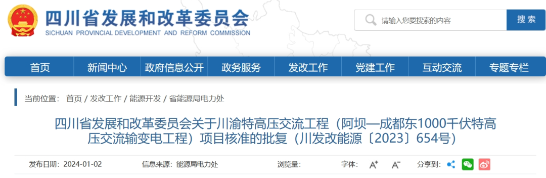 一、根據國家和四川省“十四五”電力發(fā)展規(guī)劃,為滿足阿壩州清潔能源基地電力送出需求,提升成都負荷中心供電保障能力和電網運行可靠性,按照國家發(fā)展改革委、國家能源局工作部署,同意核準建設川渝特高壓交流工程(阿壩—成都東1000千伏特高壓交流輸變電工程)。項目單位為國網四川省電力公司。