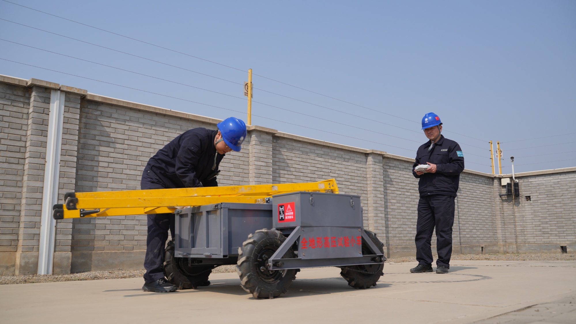 作業(yè)人員操作全地形高壓試驗小車運輸儀器(沈佳明 攝)