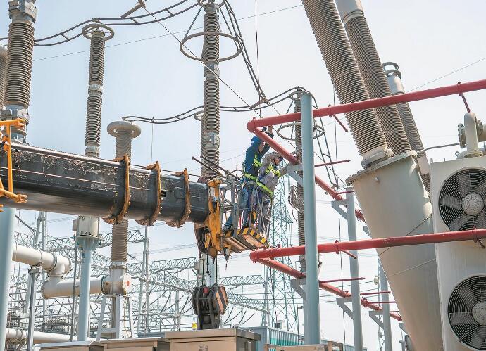 檢修人員在古泉換流站開展升壓變壓器試驗(yàn)接線作業(yè)。穆靖宇 攝