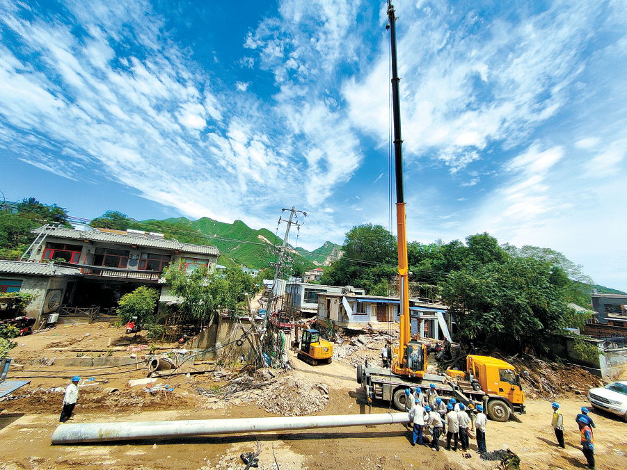 國(guó)家電網(wǎng)海淀區(qū)突擊隊(duì)員跨越湍急的河水,在房山區(qū)張坊鎮(zhèn)河道兩岸快速架設(shè)電線桿,恢復(fù)受損線路。 王洋 攝