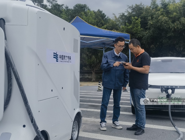 在G80廣昆高速容縣服務(wù)區(qū),南方電網(wǎng)廣西電網(wǎng)公司工作人員指引幫助返鄉(xiāng)群眾使用移動(dòng)充電車(chē)充電。通訊員 董申頌 攝