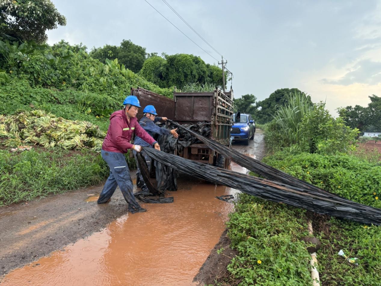 9月5日,南網(wǎng)超高壓公司海口分局員工與村民一起冒雨清理一處塑料地膜,徹底消除此處飄掛物隱患。朱陽(yáng) 攝