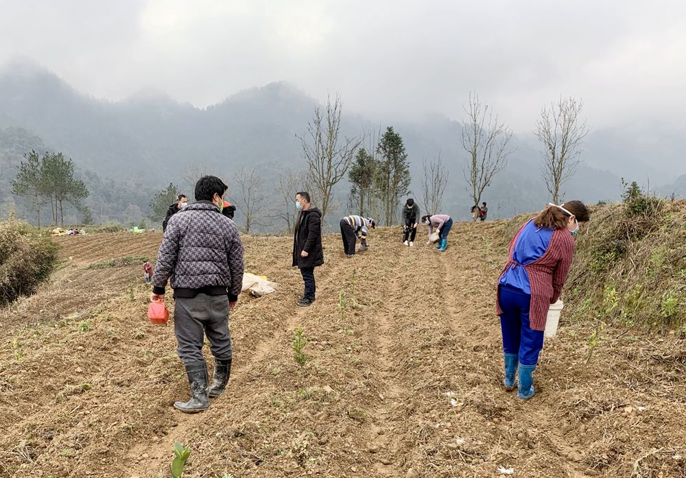 然而在村里的油茶種植基地里卻是另外一番場(chǎng)景,幾輛拖拉機(jī)來(lái)往運(yùn)送土豆種子,二十幾個(gè)村民戴著口罩在地里忙碌著,整地、挖坑、選種、澆水、施肥,一幅生機(jī)勃勃的景象。