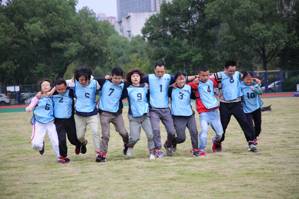 參賽隊員相鄰之間的腿綁在一起,齊心沖到終點,期間不能摔倒,用時最短的隊伍取勝。