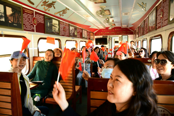伴隨著交通列車(chē)從站臺(tái)出發(fā)的轟鳴聲,女職工們踏上位于第四節(jié)車(chē)廂的“移動(dòng)書(shū)屋”。紅色米軌、星火燎原,車(chē)廂兩側(cè)的發(fā)生在滇越鐵路開(kāi)遠(yuǎn)段的紅色故事主題海報(bào),詳細(xì)記述了滇越鐵路歷史和開(kāi)遠(yuǎn)火車(chē)站背后的革命故事,讓大家重溫崢嶸歲月,身臨其境地感悟開(kāi)遠(yuǎn)革命的發(fā)展歷程。