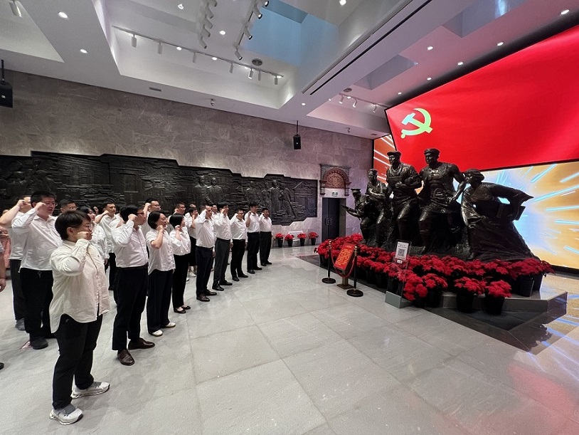 在紀念館內,上海公司黨員干部沿著歷史脈絡,通過多媒體互動技術身臨其境地感受了1925年中共四大召開的生動場景,一件件珍貴的館藏文物、一幅幅生動的歷史圖片、一段段詳實的文字記錄,全方位展現(xiàn)了中共四大在黨的歷史上的重要意義。在黨旗下,全體黨員佩戴黨徽,舉起右拳,一起重溫入黨誓詞,用發(fā)自內心的聲音表達對黨的絕對忠誠,共同說出為共產主義奮斗終身的鏗鏘誓言。
