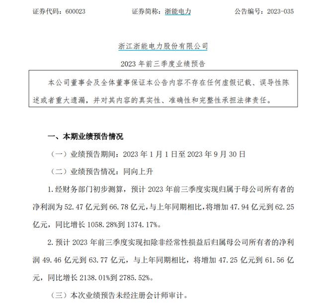 浙能電力稱,經(jīng)財務部門初步測算,預計2023年前三季度實現(xiàn)歸屬于母公司所有者的凈利潤為52.47億元到66.78億元,與上年同期相比,將增加47.94億元到62.25億元,同比增長1058.28%到1374.17%。預計2023年前三季度實現(xiàn)扣除非經(jīng)常性損益后歸屬母公司所有者的凈利潤49.46億元到63.77億元,與上年同期相比,將增加47.25億元到61.56億元,同比增長2138.01%到2785.52%。