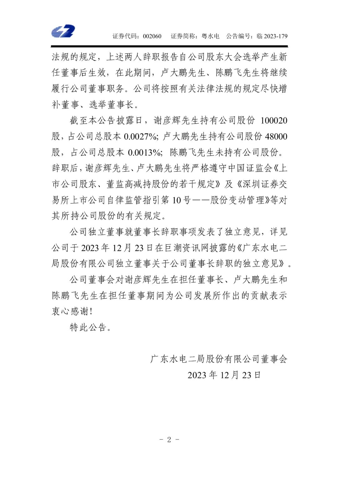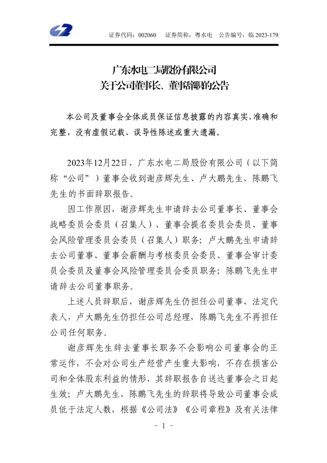 12月23日,粵水電發(fā)布公告稱,因工作原因,謝彥輝申請辭去公司董事長、董事會(huì)戰(zhàn)略委員會(huì)委員(召集人)、董事會(huì)提名委員會(huì)委員、董事會(huì)風(fēng)險(xiǎn)管理委員會(huì)委員(召集人)職務(wù);盧大鵬申請辭去公司董事、董事會(huì)薪酬與考核委員會(huì)委員、董事會(huì)審計(jì)委員會(huì)委員及董事會(huì)風(fēng)險(xiǎn)管理委員會(huì)委員職務(wù);陳鵬飛申請辭去公司董事職務(wù)。