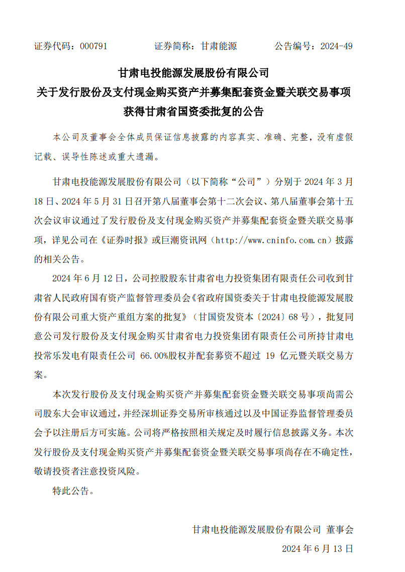 甘肅能源發(fā)布公告稱,6月12日,公司控股股東甘肅省電力投資集團有限責任公司收到甘肅省人民政府國有資產(chǎn)監(jiān)督管理委員會《省政府國資委關(guān)于甘肅電投能源發(fā)展股份有限公司重大資產(chǎn)重組方案的批復》(甘國資發(fā)資本〔2024〕68號),批復同意公司發(fā)行股份及支付現(xiàn)金購買甘肅省電力投資集團有限責任公司所持甘肅電投常樂發(fā)電有限責任公司66.00%股權(quán)并配套募資不超過19億元暨關(guān)聯(lián)交易方案。
