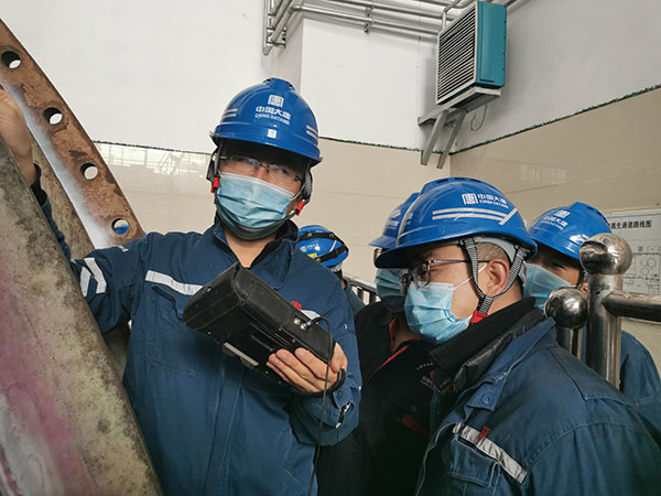 張博(左一)為青年職工講解轉(zhuǎn)輪支架縫隙測試儀使用方法