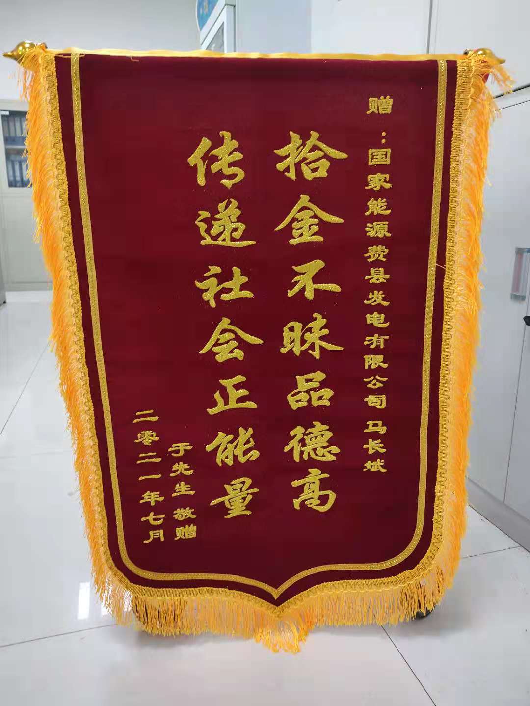 7月26日上午十點,費(fèi)縣于先生懷著無比激動的心情將一面錦旗送到公司東門值班室,錦旗上書寫著:“贈國家能源費(fèi)縣發(fā)電有限公司馬長斌:拾金不昧品德高,傳遞社會正能量”。