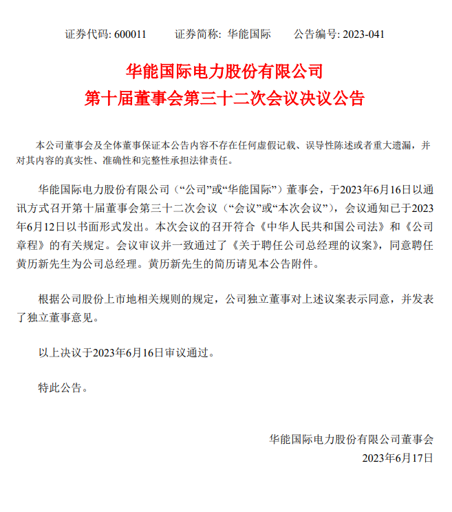2022年9月26日,華能國(guó)際原總經(jīng)理趙平先生因年齡原因辭職。華能國(guó)際公告稱,在華能國(guó)際聘任新任總經(jīng)理前,由華能國(guó)際董事長(zhǎng)趙克宇先生代行總經(jīng)理職責(zé)。時(shí)隔9個(gè)月,華能國(guó)際總經(jīng)理一職終于迎來(lái)新人選!2023年6月16日,華能國(guó)際召開董事會(huì),審議并一致通過(guò)了《關(guān)于聘任公司總經(jīng)理的議案》,同意聘任黃歷新先生為公司總經(jīng)理。