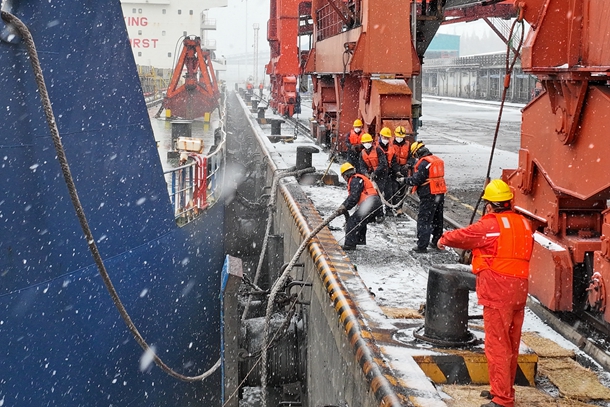 圖為燃料人員正在風(fēng)雪中進(jìn)行海輪帶纜作業(yè)