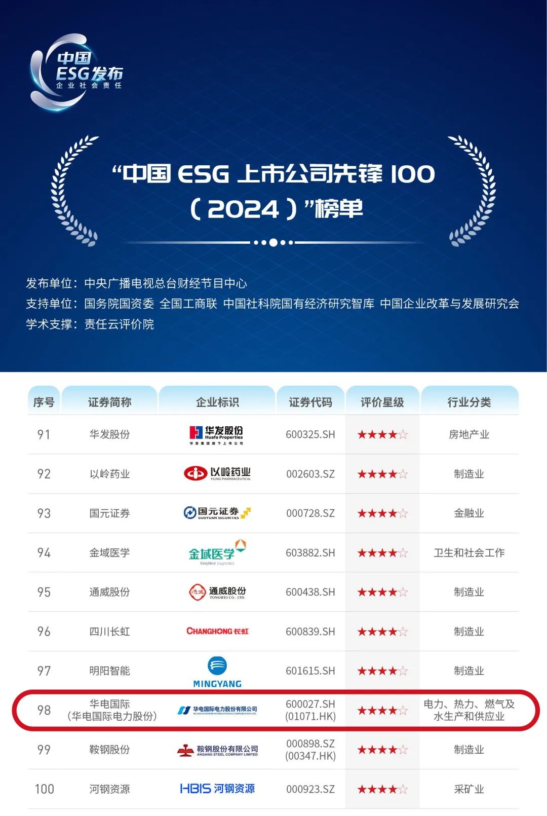 6月30日下午,中央廣播電視總臺財(cái)經(jīng)節(jié)目中心聯(lián)合國務(wù)院國資委、全國工商聯(lián)、中國社科院國有經(jīng)濟(jì)研究智庫、中國企業(yè)改革與發(fā)展研究會在京正式發(fā)布“中國ESG(企業(yè)社會責(zé)任)《2024年度ESG行動報告》”。《報告》公布了“中國ESG上市公司先鋒100”榜單,中國華電所屬華電國際電力股份有限公司成功入圍。