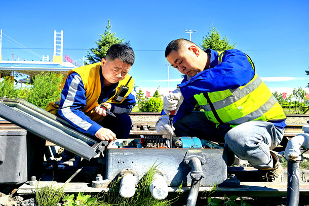 圖為信號(hào)工檢修電動(dòng)轉(zhuǎn)轍機(jī)