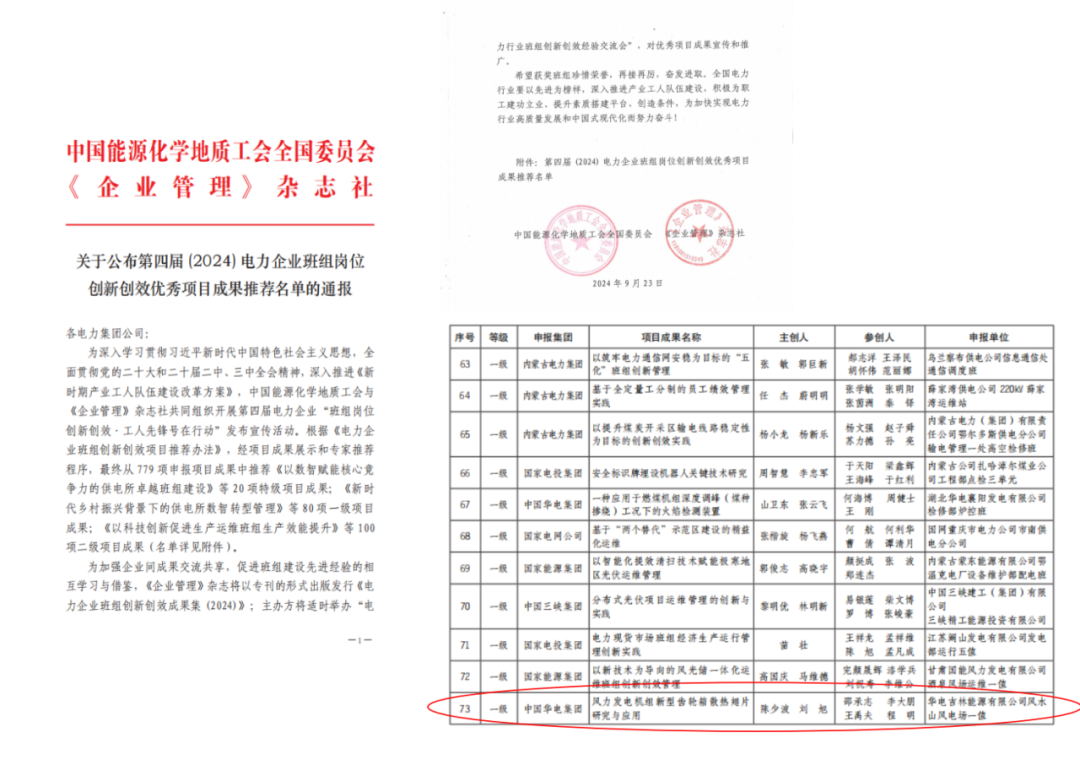 近日,從中國能源化學(xué)地質(zhì)工會獲悉,華電吉林公司大安風(fēng)水山風(fēng)電場班組成果“風(fēng)力發(fā)電機組新型齒輪箱散熱翅片研究與應(yīng)用”榮獲中國能源化學(xué)地質(zhì)工會第四屆(2024)電力企業(yè)班組崗位創(chuàng)新創(chuàng)效優(yōu)秀項目成果一級獎。