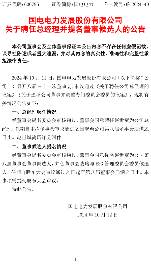 2024年10月11日,國電電力召開八屆三十一次董事會,審議通過《關于聘任公司總經(jīng)理的議案》《關于選舉公司董事并調(diào)整專門委員會委員的議案》。經(jīng)董事會提名委員會審核通過,董事會同意聘任趙世斌為公司總經(jīng)理,任期自本次董事會審議通過之日起至公司第八屆董事會屆滿之日止。經(jīng)董事會提名委員會審核通過,董事會同意提名趙世斌為公司第八屆董事會董事候選人,并任董事會戰(zhàn)略與ESG管理委員會委員候選人,任期自股東大會審議通過之日起至第八屆董事會屆滿之日止。