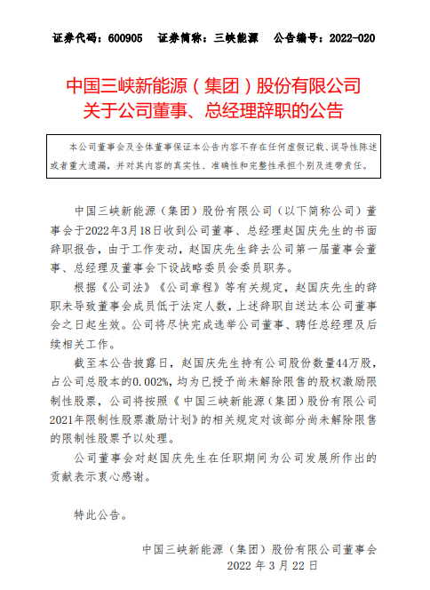 3月21日,三峽能源發(fā)布公告稱(chēng),公司董事會(huì)于3月18日收到公司董事、總經(jīng)理趙國(guó)慶的書(shū)面辭職報(bào)告,由于工作變動(dòng),趙國(guó)慶先生辭去公司第一屆董事會(huì)董事、總經(jīng)理及董事會(huì)下設(shè)戰(zhàn)略委員會(huì)委員職務(wù)。