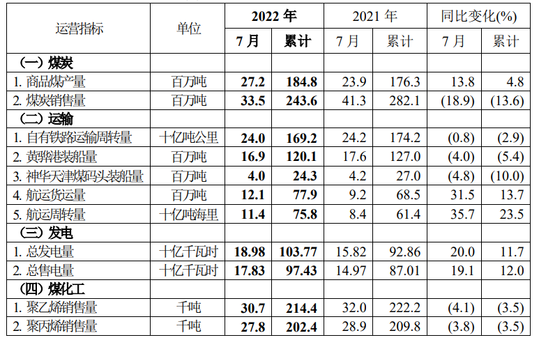 中國神華發(fā)布2022年7月份主要運營數(shù)據(jù)。2022年7月,中國神華總發(fā)電量189.8億千瓦時,同比增長20.0%;2022年1-7月,中國神華總發(fā)電量1037.7億千瓦時,同比增長11.7%。