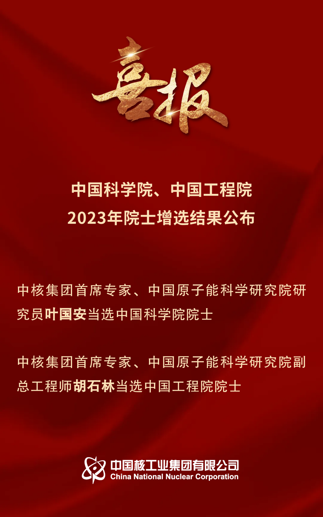 11月22日,2023年兩院院士增選結(jié)果正式揭曉,中核集團(tuán)首席專家、中國(guó)原子能科學(xué)研究院研究員葉國(guó)安當(dāng)選中國(guó)科學(xué)院院士;中核集團(tuán)首席專家、中國(guó)原子能科學(xué)研究院副總工程師胡石林當(dāng)選中國(guó)工程院院士。