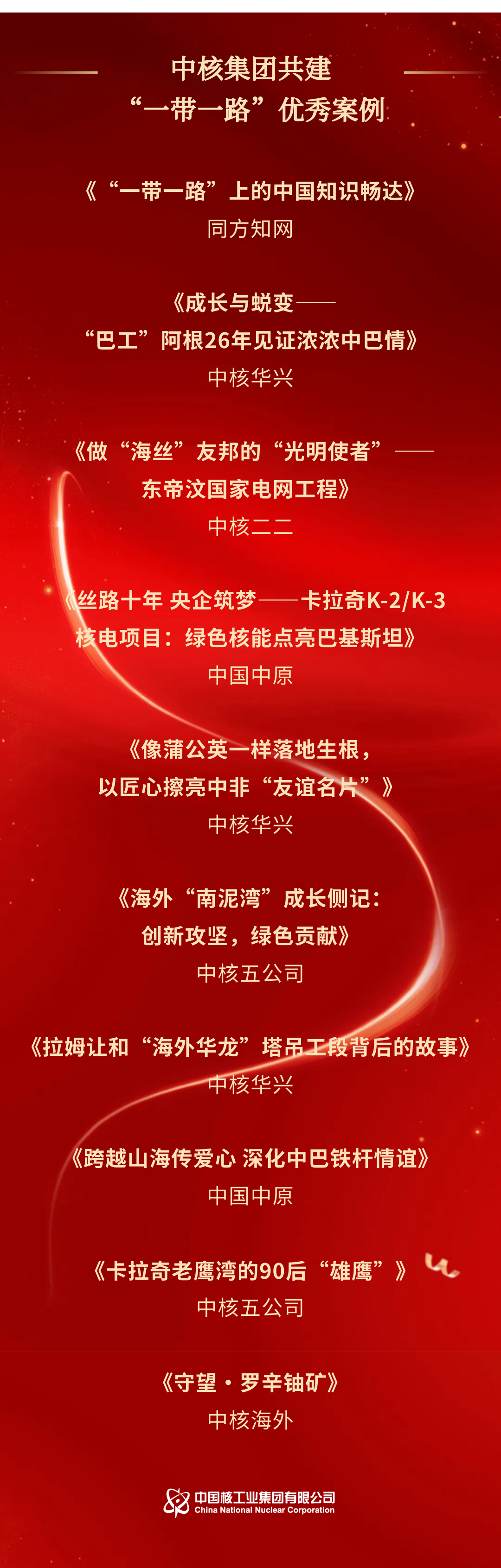 2023年是共建“一帶一路”倡議提出十周年。中核集團積極踐行“一帶一路”倡議,與沿線各國合作伙伴密切協(xié)作,不斷擴大高水平開放合作,取得了實打?qū)?、沉甸甸的成就,涌現(xiàn)出了一批優(yōu)秀的故事和案例。會上發(fā)布了2023年中核集團“了不起的核工業(yè)”品牌故事。