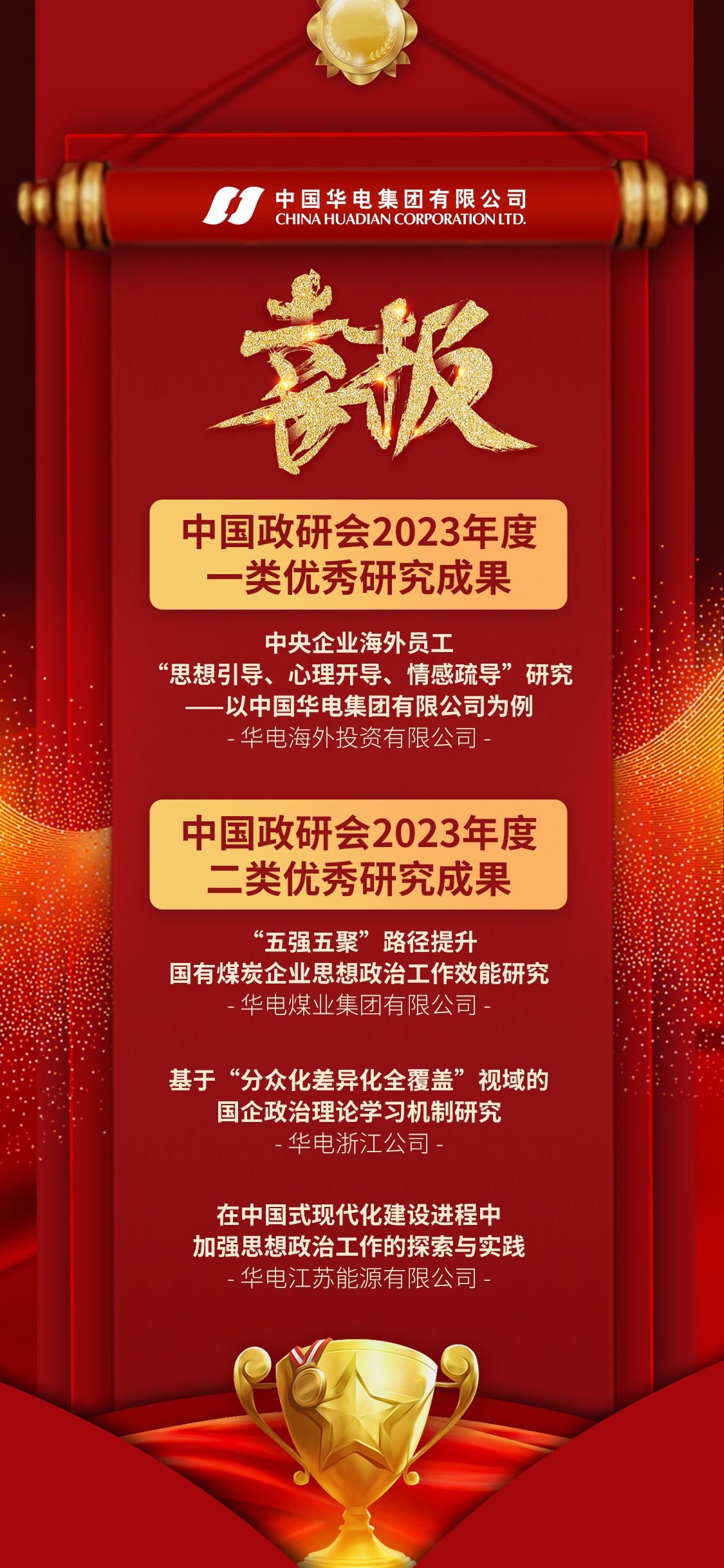 近日,經(jīng)中央宣傳部領(lǐng)導批準,中國思想政治工作研究會2023年度一、二、三類優(yōu)秀研究成果評選結(jié)果揭曉。集團公司《中央企業(yè)海外員工“思想引導、心理開導、情感疏導”研究——以中國華電集團有限公司為例》研究成果獲評一類優(yōu)秀研究成果,《“五強五聚”路徑提升國有煤炭企業(yè)思想政治工作效能研究》等3項研究成果獲評二類優(yōu)秀研究成果,所獲榮譽為全國思想政治工作研究領(lǐng)域最高獎項,等次和數(shù)量在全國政研會系統(tǒng)以及央企系統(tǒng)中名列前茅。這是繼獲得中央企業(yè)、中國電力政研會最高榮譽后,集團公司思想政治工作研究成果再次取得突破、創(chuàng)出佳績。