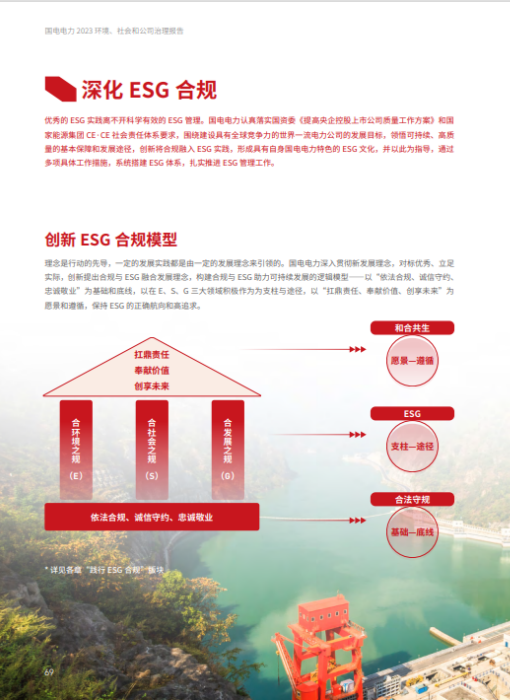 國電電力積極探索以質(zhì)量為支撐、誠信為基石、社會責(zé)任為核心、品牌為名片的“四位一體”建設(shè)路徑,創(chuàng)新提出ESG合規(guī)融合發(fā)展理念,精心打造“1+N”ESG報告體系,運(yùn)用ESG治理思維指導(dǎo)業(yè)務(wù)工作,找準(zhǔn)生產(chǎn)、經(jīng)營和管理與ESG體系建設(shè)的融合點(diǎn),為高質(zhì)量推進(jìn)ESG治理打下基礎(chǔ),助力加快建設(shè)具有全球競爭力的世界一流電力公司。