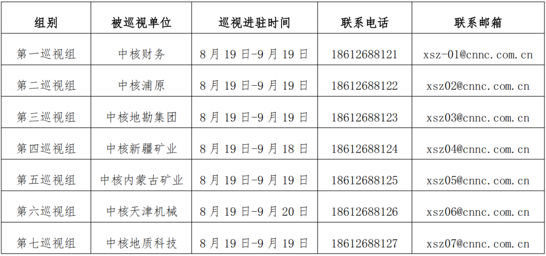 根據(jù)中核集團(tuán)黨組巡視工作統(tǒng)一部署,8月19日,黨組第一至第七巡視組分別進(jìn)駐中核財(cái)務(wù)有限責(zé)任公司、上海中核浦原有限公司、中核地質(zhì)勘查集團(tuán)有限公司、中核新疆礦業(yè)有限公司、中核內(nèi)蒙古礦業(yè)有限公司、中核(天津)機(jī)械有限公司、中核地質(zhì)科技有限公司等7家單位并召開巡視工作動(dòng)員會。