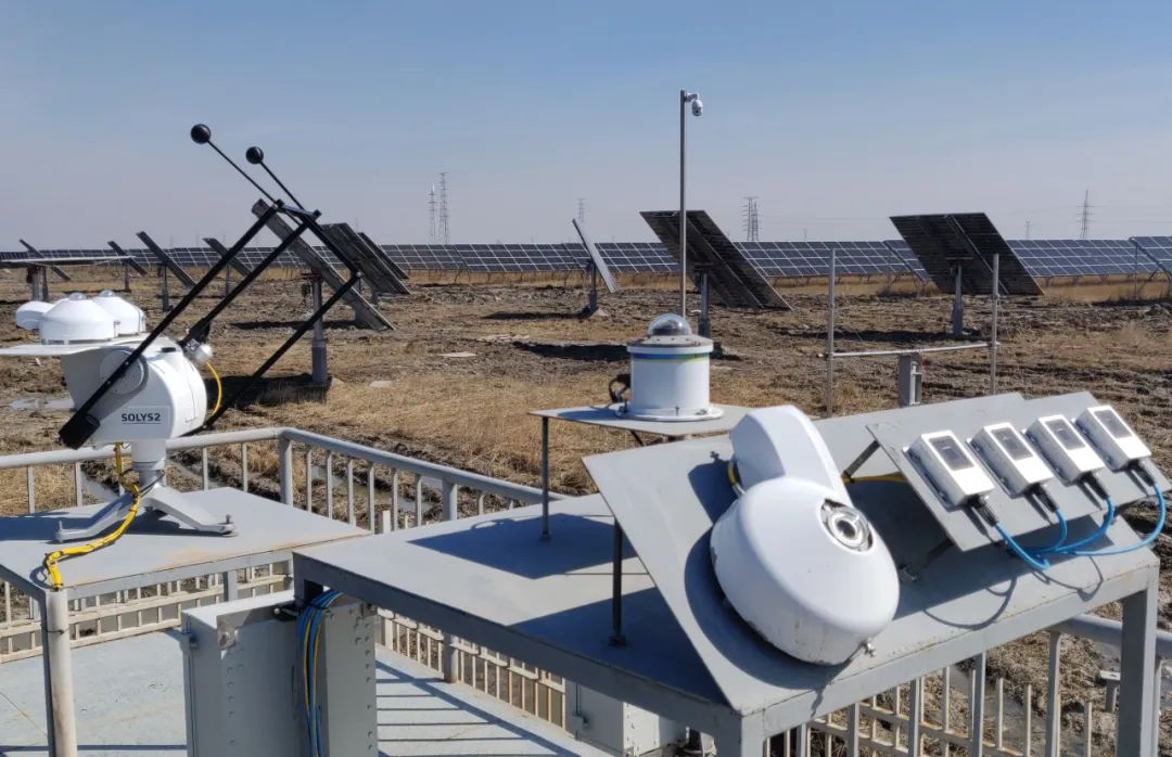▲國家光伏、儲能實證實驗平臺(大慶基地)布置氣象站,主要用于監(jiān)測當(dāng)?shù)剌椪铡囟取⒐庾V紫外、風(fēng)速風(fēng)向等氣象數(shù)據(jù)。