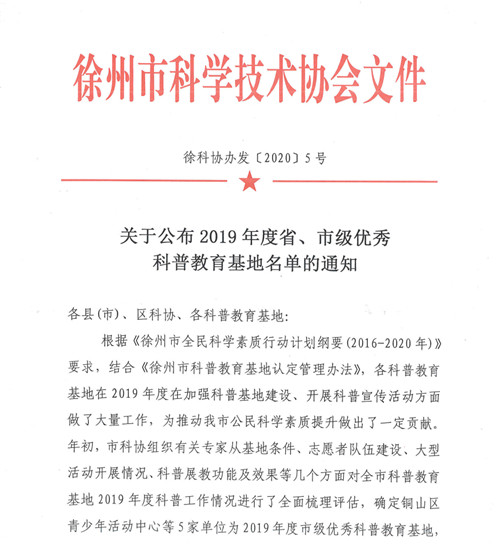 中國(guó)電力網(wǎng)訊 近日,徐州市科協(xié)發(fā)布《關(guān)于公布2019年度省、市級(jí)優(yōu)秀科普教育基地名單的通知》(徐科協(xié)辦發(fā)﹝2020﹞5號(hào)),公司在72家科普教育基地中脫穎而出,被評(píng)為2019年徐州市優(yōu)秀科普教育基地,并獲得專項(xiàng)獎(jiǎng)勵(lì),是徐州市唯一一家獲得表彰的企業(yè)類科普教育基地。