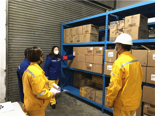 本次檢查采取“對賬銷號”的形式嚴格對照擬定的《復工復產疫情防控監(jiān)督檢查表》《江蘇大區(qū)疫情防控監(jiān)督工作表》進行檢查,確保檢查內容全覆蓋、檢查要點不遺漏。檢查組先后前往EHS部、辦公室、技術支持部、發(fā)電部檢查復工復產與疫情防控工作的制度建立、責任落實、人員防護、防疫準備等情況,掌握總體工作開展情況和必要的臺賬資料;同時深入公司食堂及倉庫區(qū)域,全面檢查食堂區(qū)域的菜品采購及入庫、衛(wèi)生消毒、體溫檢測、分餐規(guī)定等疫情防控措施落實情況,以及倉庫區(qū)域的防護物品儲備情況。