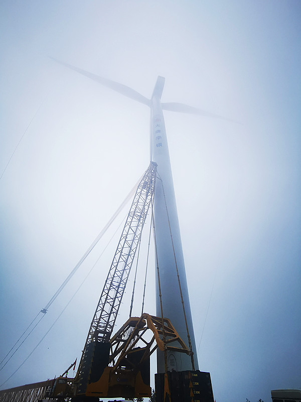 該項(xiàng)目自2021年8月2日全面開工建設(shè)以來,全員克服時(shí)間緊、任務(wù)重,以及夏季長(zhǎng)時(shí)間高溫、近期溫度驟降、山上風(fēng)力較大等重重困難,縝密部署,團(tuán)結(jié)拼搏,以扎實(shí)的管理、良好的協(xié)調(diào)、有力的措施,特別是針對(duì)作業(yè)高峰期充分討論、采取舉措,在大件運(yùn)輸、吊裝等工作中做到了有方案、有計(jì)劃、有落實(shí)。經(jīng)過節(jié)假無休、連續(xù)作戰(zhàn),先后完成了十臺(tái)風(fēng)機(jī)基礎(chǔ)澆筑工作,并于10月13日正式完成首臺(tái)風(fēng)機(jī)吊裝工作,呈現(xiàn)出“驕陽壁嶺轟聲震,崇山風(fēng)嘯鐵臂搖”的一派火熱建設(shè)局面。