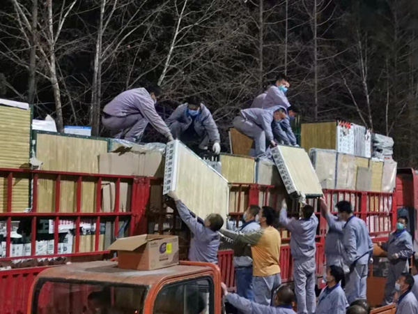 晚上21:40,行軍床運到,中層干部、共產(chǎn)黨員、一線職工不分你我、爭先恐后爬上卡車搬運。“大家戴上手套,注意安全,別傷著自己。”就在此時,一直掛念著駐廠職工們的該公司黨委書記、總經(jīng)理任寶銅也來到了現(xiàn)場,親切的囑咐大家做好防護、小心搬運。