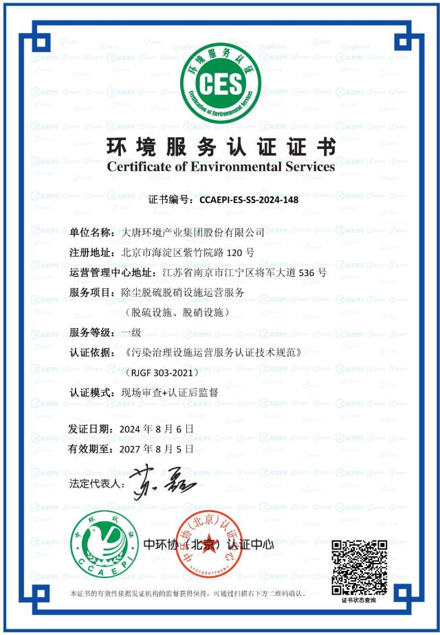 中國電力網(wǎng)訊(通訊員 黃婉婉)10月16日,大唐環(huán)境特許經(jīng)營分公司收到中環(huán)協(xié)(北京)認證中心頒發(fā)的“除塵脫硫脫硝設施運營服務”一級服務認證證書。這一殊榮不僅是對環(huán)境公司及分公司在脫硫脫硝領(lǐng)域?qū)I(yè)能力的肯定,更是對其長期致力于環(huán)境保護事業(yè)、推動綠色可持續(xù)發(fā)展努力的認可。
