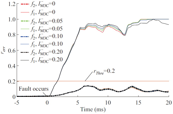 縱聯(lián)電流差動保護憑借其優(yōu)異性能成為新能源送出高壓交流線路主保護。在同步機系統(tǒng)中,故障線路兩側(cè)電流基本同相,縱聯(lián)電流差動保護具有很高的靈敏度。新能源場站接入強電網(wǎng)場景下,即便新能源側(cè)與電網(wǎng)側(cè)故障電流相位差異較大,但因二者提供故障電流幅值的能力有顯著區(qū)別,當(dāng)幅值差大于特定值時,使得任何電流相位差下縱聯(lián)電流差動保護都能正常工作。相較于前兩個場景,在低頻輸電系統(tǒng)中,縱聯(lián)電流差動保護的靈敏度與GSC和M3C提供的負(fù)序電流密切相關(guān)。兩者注入的負(fù)序電流越低,靈敏度越低,從而引起保護誤動作。單相接地故障及兩相相間故障下,當(dāng)GSC和M3C均抑制其輸出負(fù)序電流時,故障支路電流在穩(wěn)態(tài)時理論值降為0,因此僅基于電流的穩(wěn)態(tài)量保護將在原理上失效。