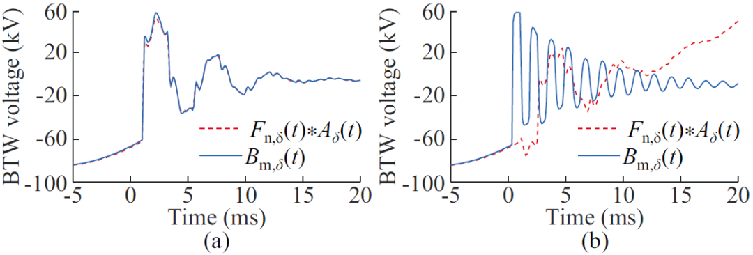 圖3 經(jīng)本端與對端模量信息計算的電壓反行波對比 (a) 區(qū)外故障 (b) 區(qū)內(nèi)故障