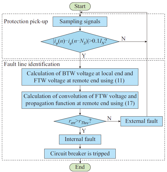 典型的換流器故障控制策略雖能弱化故障特征,但在故障暫態(tài)階段,故障特征主要受到海纜中電容和電感間能量交換的影響。同時,換流器控制系統(tǒng)完成指定目標(biāo)需要一定時間,因此故障支路電流在故障暫態(tài)階段幅值較大并逐漸減小。充分利用該階段的故障信息,即可實現(xiàn)故障識別。鎧裝三芯海纜包含導(dǎo)芯、金屬屏蔽層和鎧裝,多導(dǎo)體之間存在電磁耦合,單獨分析相電氣量困難。對此,首先利用時域暫態(tài)信號相模變換,篩選出能夠反映各種故障類型的模量。Marti模型考慮了線路頻變特性,能夠根據(jù)對端電壓前行波準(zhǔn)確計算本端電壓反行波。為了在低采樣率下實現(xiàn)計算,推導(dǎo)了基于插值的高精度電壓反行波電壓表達式。基于電壓反行波差異的海上風(fēng)電低頻輸電系統(tǒng)海纜縱聯(lián)保護方案流程圖如圖2所示。保護啟動后,首先根據(jù)本端模量信息計算本端電壓反行波,然后通過對端電壓前行波與傳播函數(shù)間的卷積來計算本端電壓反行波,最終比較二者差異以實現(xiàn)海纜保護。