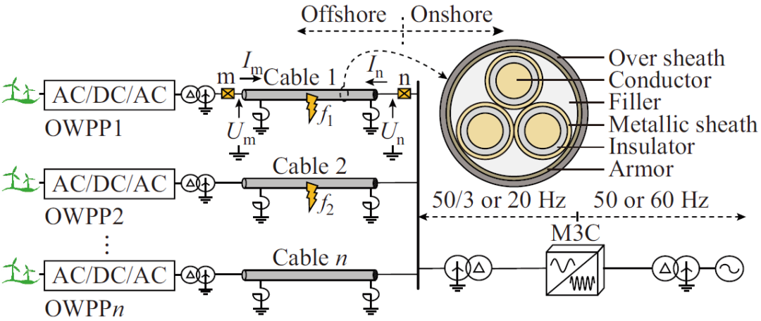 圖1給出了海上風(fēng)電低頻輸電系統(tǒng)拓?fù)?,海纜需匯集來自于風(fēng)電場的電能,并經(jīng)模塊化多電平矩陣換流器(modular multilevel matrix converter,M3C)實現(xiàn)頻率轉(zhuǎn)換,從而在M3C低頻側(cè)構(gòu)成了100%電力電子源場景。相較于同步機系統(tǒng)在負(fù)序網(wǎng)絡(luò)中源側(cè)只體現(xiàn)阻抗特性,低頻輸電系統(tǒng)負(fù)序網(wǎng)絡(luò)中線路兩側(cè)均可體現(xiàn)為電源特性。根據(jù)單相接地故障和兩相相間故障復(fù)合序網(wǎng)圖,故障支路電流可由負(fù)序電流唯一確定,當(dāng)M3C和海上風(fēng)電場網(wǎng)側(cè)變流器(grid-side converter, GSC)抑制負(fù)序電流時,盡管故障點處存在負(fù)序電壓源,但兩側(cè)換流器均會生成幅值相位相同的電壓源,以抵消系統(tǒng)中的負(fù)序電流,因此系統(tǒng)故障電流仍保持對稱,使得故障支路的穩(wěn)態(tài)電流為0。上述分析表明,雖然風(fēng)電場升壓變壓器和M3C低頻側(cè)隔離變壓器網(wǎng)側(cè)中性點均采取直接接地方式,但低頻輸電系統(tǒng)在特定故障控制策略下呈現(xiàn)出類似于中性點非直接接地系統(tǒng)的故障特征。