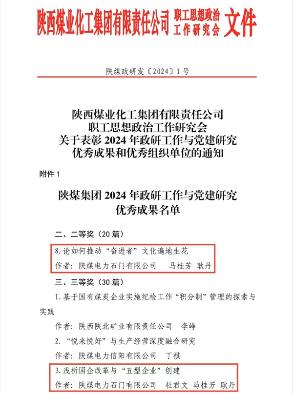中國電力網(wǎng)訊 (通訊員:馬桂芳)10月30日,陜煤集團思想政治工作研究會發(fā)布了《關(guān)于表彰2024年政研工作與黨建研究優(yōu)秀成果和優(yōu)秀組織單位的通知》,陜煤石門發(fā)電公司2項政研課題獲表彰。其中,《論如何推動“奮進者”文化遍地生花》獲評集團公司優(yōu)秀成果二等獎,《淺析國企改革與“五型企業(yè)”創(chuàng)建》獲評集團公司優(yōu)秀成果三等獎。